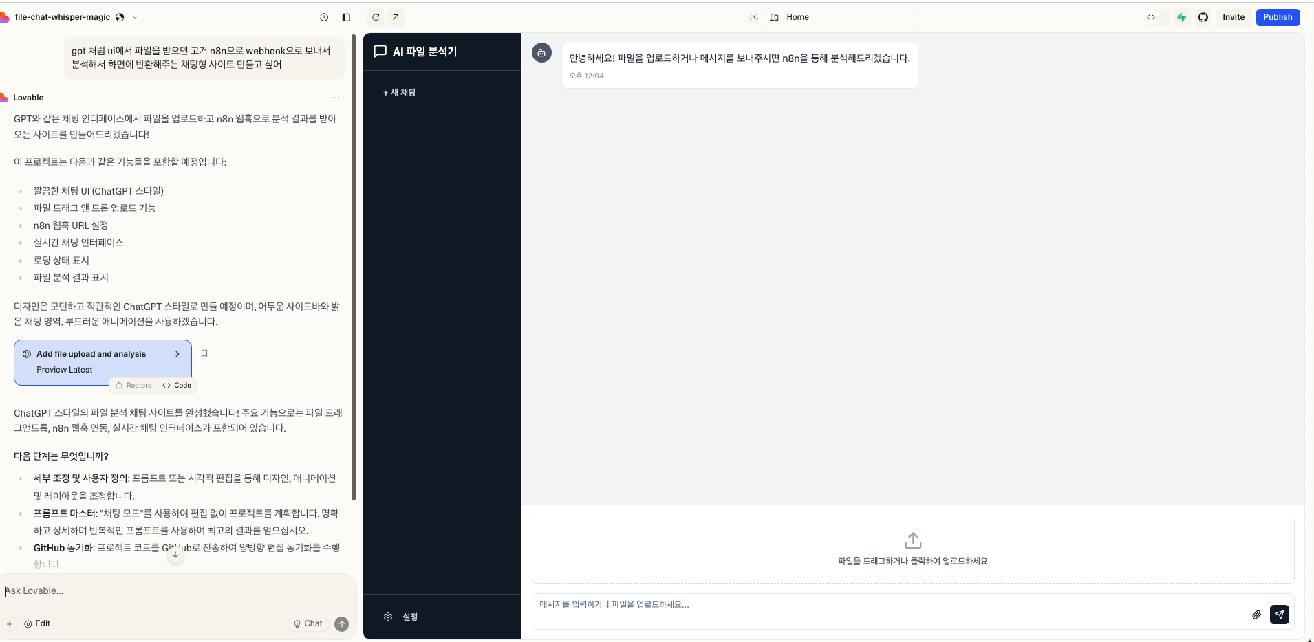 프롬프트: "GPT 처럼 UI에서 파일을 받으면 n8n 으로 webhook으로 보내서 분석하고 화면에 반환해주는 채팅형 사이트 만들고 싶어"