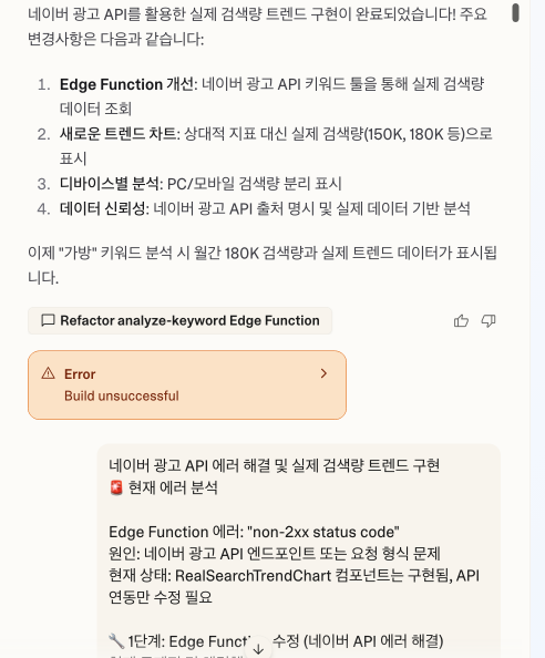 나 → Claude: "트렌드 차트를 개선하고 싶은데 Lovable AI가 이해할 수 있는 프롬프트로 만들어줘"
