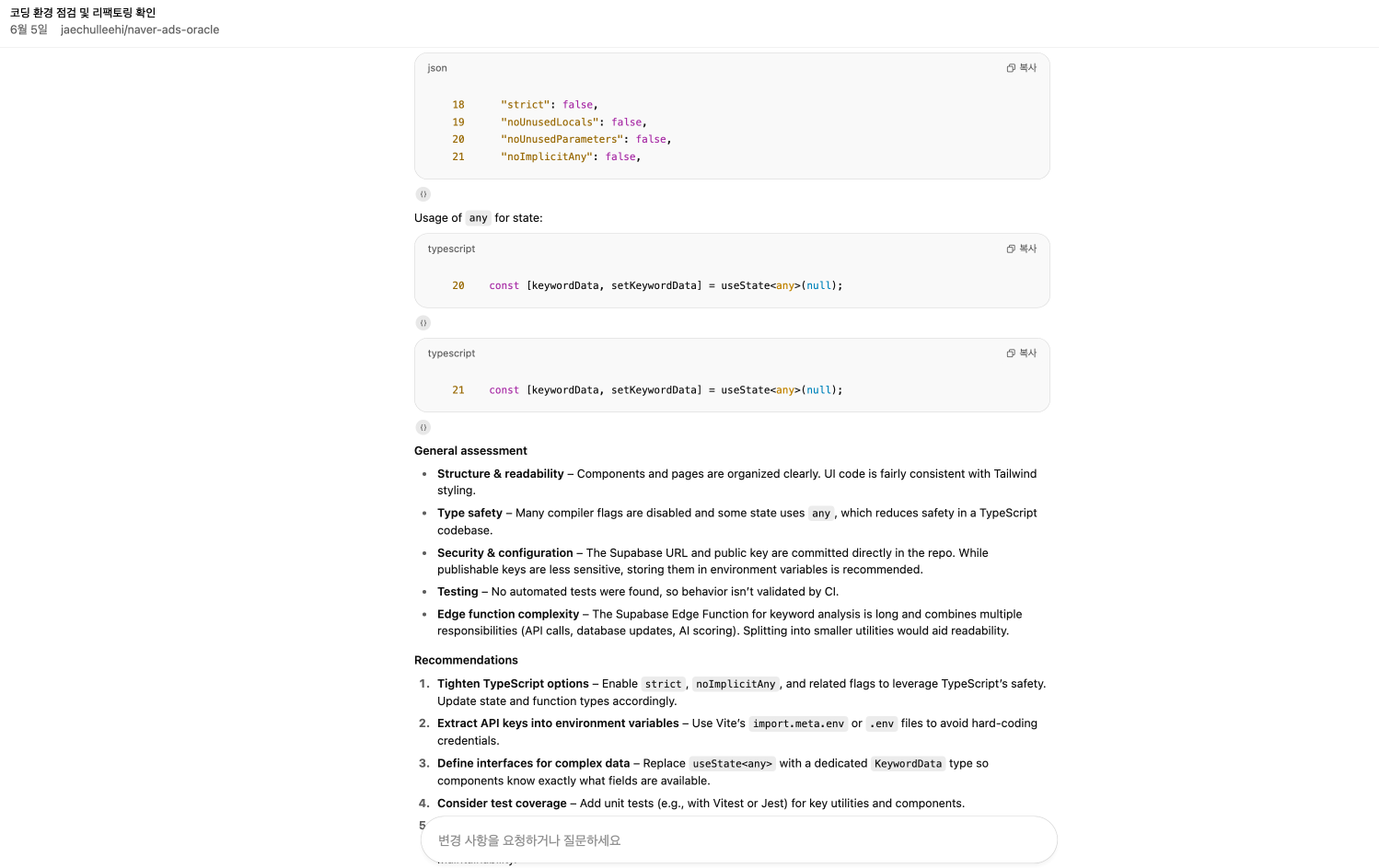 물론 이것도 AI를 활용하는 부분이었지만, 바이브 코딩을 만들어주는 AI와 만들어져 있는 코드를 보고 분석을 해주는 AI를 통합적으로 목적에 맞춰서 활용하는 방식이 훨씬 안정감을 주었습니다.